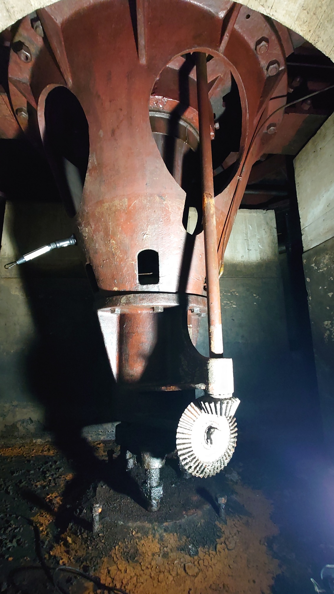 残念ながら立旋盤は巨大すぎて、保存することはかないませんでしたが、株式会社タダノインフラソリューションズ(旧 IHI運搬機械株式会社 安浦工場)殿のご厚意でモータ・整流器・立旋盤の各所で使用されていたべべルギアセットをご寄贈頂きました。